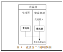 2直流屏作業(yè)原理圖1為直流屏作業(yè)原理簡圖。在圖1中,蓄電池和整流器組成了變電站的直流屏,當(dāng)有溝通輸入電源時,整流器作業(yè),把溝通電整流成直流電,與蓄電池一同協(xié)作,供給直流負(fù)荷安穩(wěn)的直流電源。