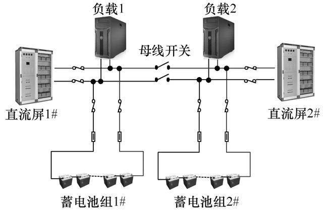 220kV變電站直流屏系統(tǒng)為例,傳統(tǒng)的配備為直流屏1#接蓄電池組1#,直流屏2#接蓄電池組2#,直流母線之間由開關(guān)操控,在呈現(xiàn)異?;虮Wo(hù)進(jìn)程中互為后備電源,其配備如圖1所示。