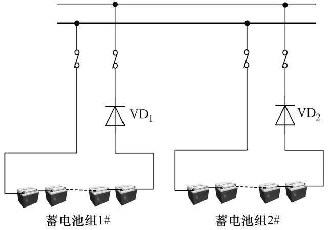 在外部溝通供電異常時(shí),蓄電池組由銜接在直流屏正極與蓄電池組正極之間的大功率二極管VD1/VD2無縫對(duì)負(fù)載進(jìn)行供電。放電通道并聯(lián)等效電路如圖4所示。在電池組并聯(lián)時(shí),即使兩組電池存在電壓差,高電壓蓄電池組與低電壓蓄電池組之間也不導(dǎo)通,不存在充電回路,故防止了環(huán)流現(xiàn)象的發(fā)生。