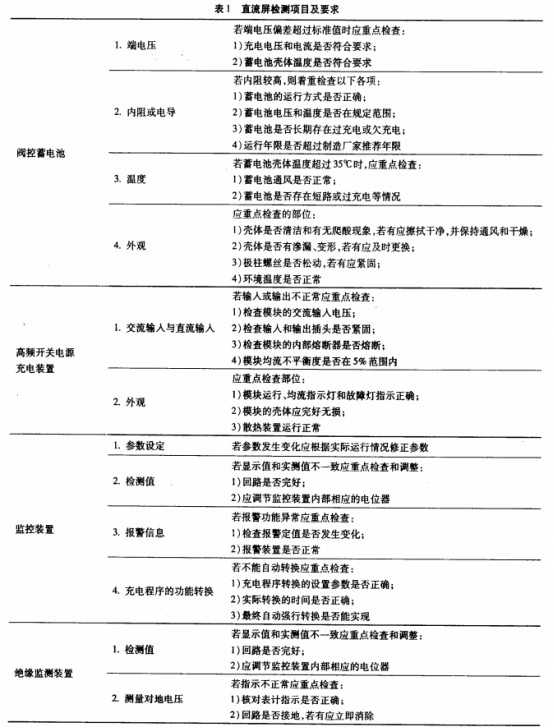 在樹立完善的點檢原則之前,首要有必要擬定符合現(xiàn)場要求,并可以作為依據(jù)的設(shè)備檢修標準。在直流屏標準中規(guī)則了直流電源體系設(shè)備檢修的基本要求,檢修前的準備、檢測項目、充放電試驗等內(nèi)容。直流屏主要由蓄電池.高頻開關(guān)電源充電設(shè)備,監(jiān)控設(shè)備、絕緣監(jiān)測設(shè)備4部分組成,見表1。