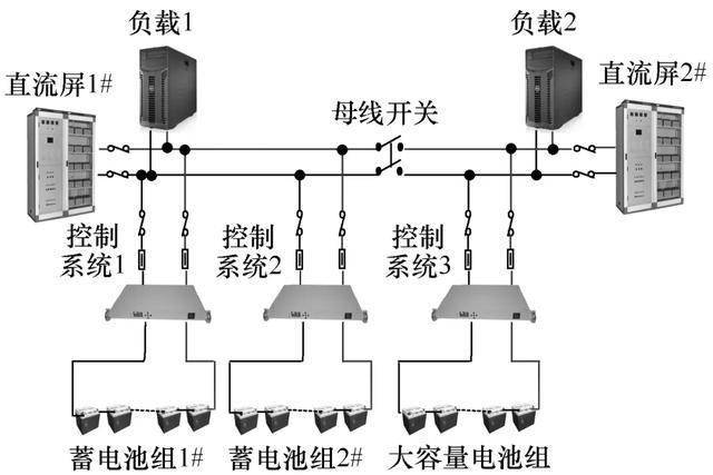 將原有的兩組蓄電池通過(guò)本文方法進(jìn)行并聯(lián)使用,形成容量更大的蓄電池系統(tǒng)接入直流母線(xiàn)1將另一個(gè)大容量的新蓄電池組及相應(yīng)的控制系統(tǒng)接入直流母線(xiàn)2。在運(yùn)行幾年后,待原有的兩組蓄電池到了使用壽命后,再更換成新的大容量的蓄電池組,將提高蓄電池組的利用率,降低電池采購(gòu)成本。