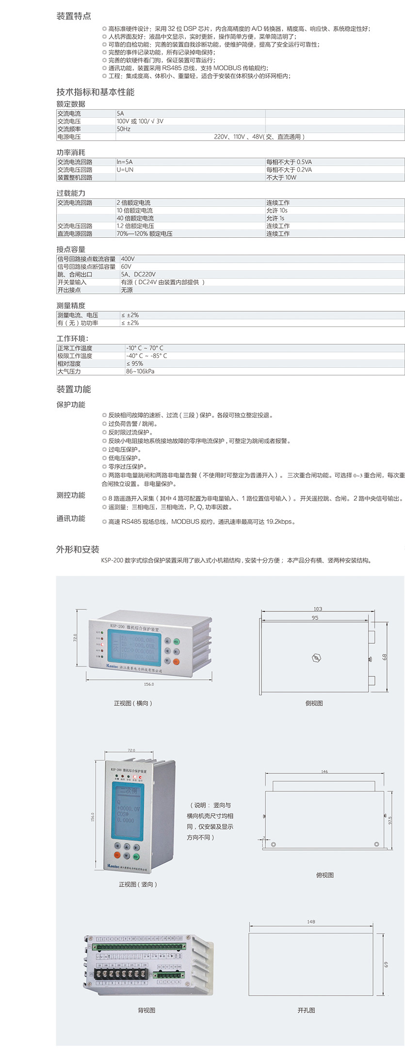 KSP-200 數(shù)字式綜合保護(hù)裝置是我公司為適應(yīng)我國(guó)電氣成套事業(yè)發(fā) 展的需要,積累多年電力自動(dòng)化產(chǎn)品開(kāi)發(fā)經(jīng)驗(yàn),運(yùn)用新技術(shù)、新工 藝而推出的一款經(jīng)濟(jì)性綜合保護(hù)裝置。裝置結(jié)構(gòu)設(shè)計(jì)緊湊、體積小巧, 交直流電源通用,可滿(mǎn)足 10KV 及以下電壓等級(jí)進(jìn)出線(xiàn)、廠用變等保 護(hù)測(cè)控功能。裝置適宜于安裝在體積狹小的環(huán)網(wǎng)柜內(nèi),構(gòu)成智能化 環(huán)網(wǎng)柜。